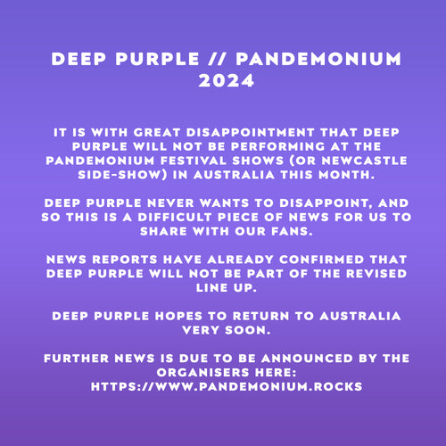 It is with great disappointment that Deep Purple will not be performing at the Pandemonium Festival shows (or Newcastle side-show) in Australia this month.
